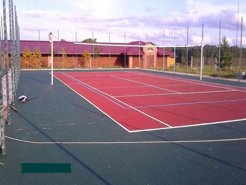 Спортивная площадка для мини-футбола размером 42х25м и волейбольная площадка для волейбола 18х9м с искусственным покрытием (полимерно-порошковое ) с устройством ограждения вокруг площадок.